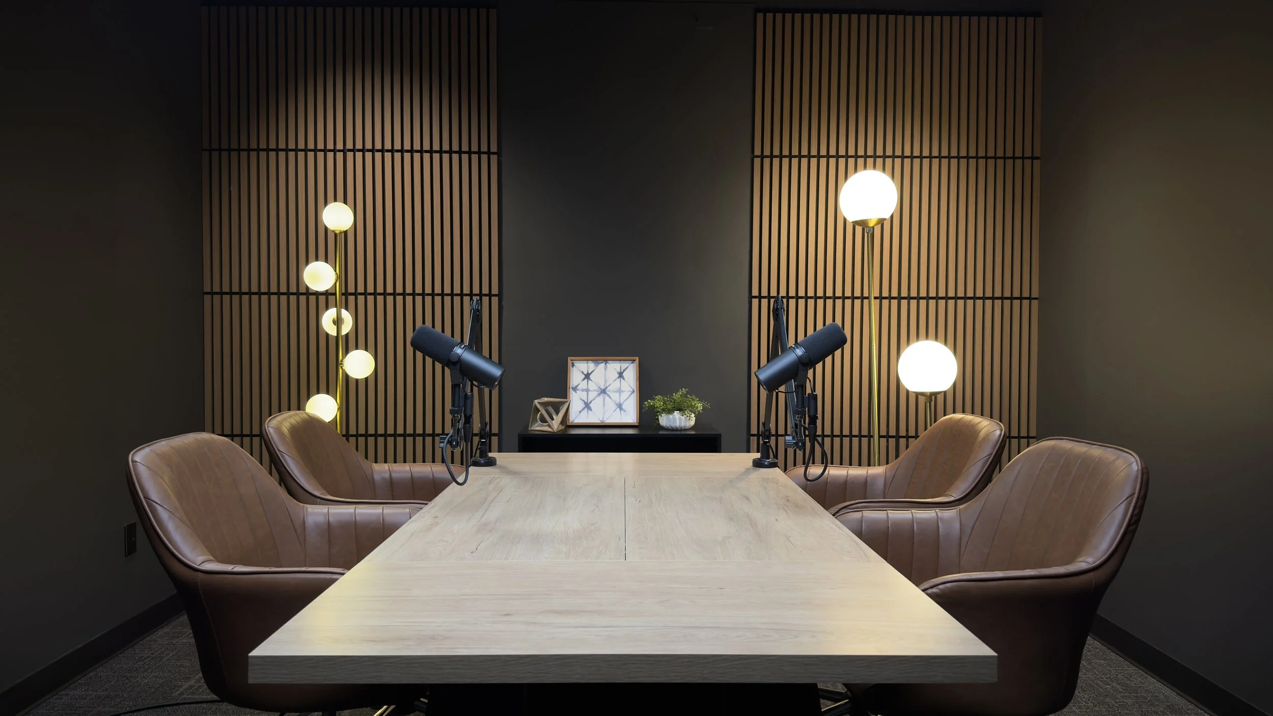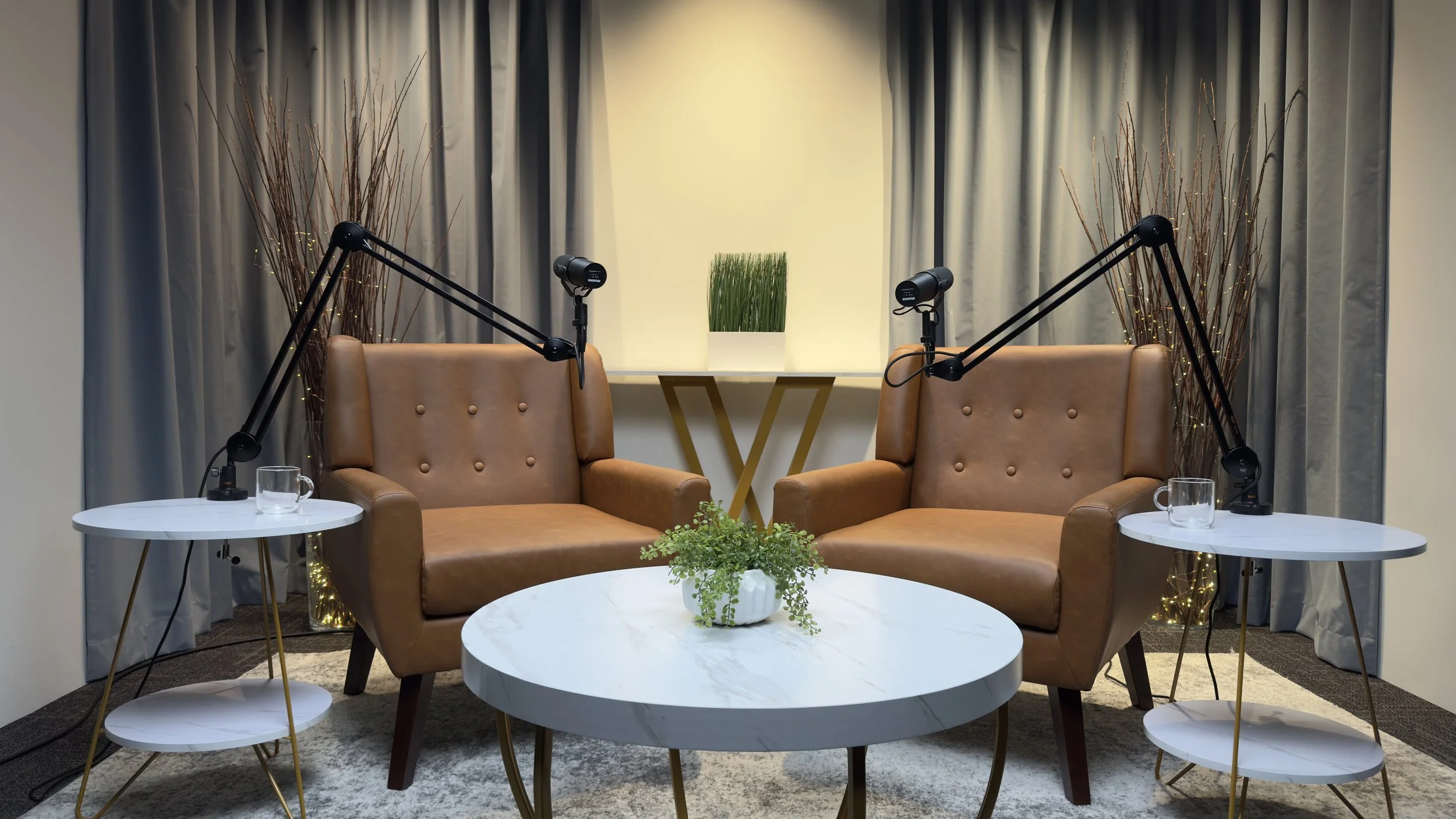 Show up ready to record to your scheduled podcast session. The studio will be set up with your requested set design when you arrive.